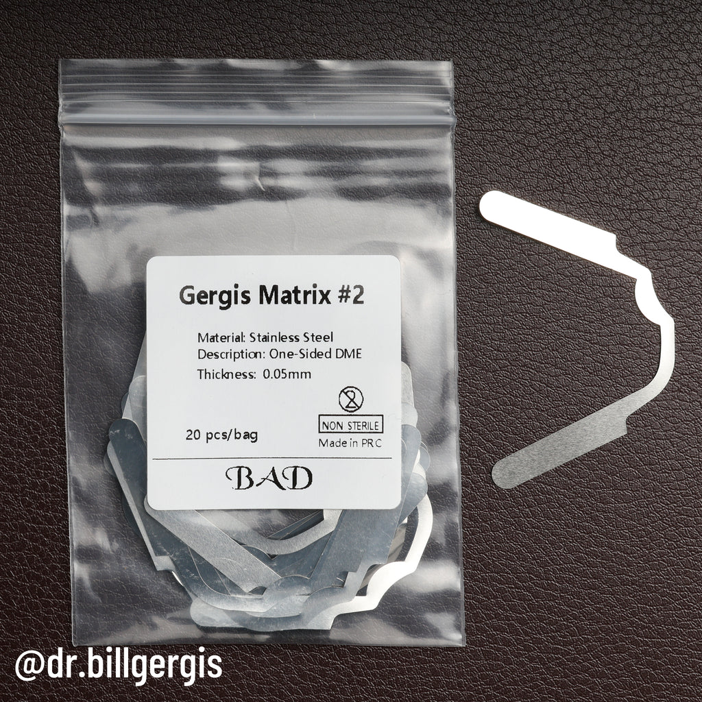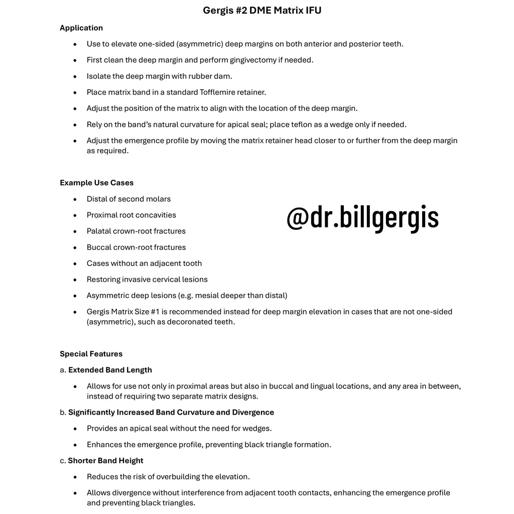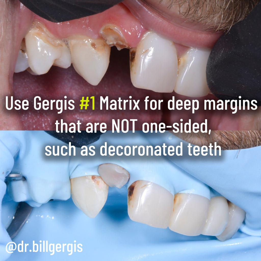 - La matrice Gergis de taille n° 1 est plutôt recommandée pour l'élévation de marge profonde dans les cas qui ne sont pas unilatéraux (asymétriques), tels que les dents décoronnées.